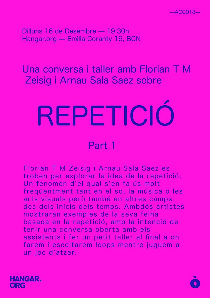 Florian T M Zeisig and Arnau Sala Saez get together to explore the idea of repetition. A widely used phenomenon in sound, music or art, but also in other fields since the beginning of existence. Both artists will show examples of their work based on repetition. We will not only speak about this phenomenon but will have an open conversation and a little workshop at the end where we will make and play loops while playing a little game of chance.
