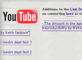 02 agosto 2006 Colección de videos en youtube, por Gpod Written by Chiu Longina Videoteletipos Leave a Comment http://greylodge.org/gpc/?p=549 – The Artwork in the Age of its Mechanical Reproducibility by Walter Benjamin as told to Keith Sanborn” – neoist dept fest 1 – neoist dept fest 2 – neoist dept fest 2.4 – neoist dept fest 3 – Fluxus – Wolf Vostell – Sun in your head – Fluxus – one way – Fluxus ·Fluxfilm 2· – Fluxus ·Fluxfilm 7· – Fluxus ·Fluxfilm 8· – Fluxus ·Fluxfilm 9· – Flux 26 _ Sharits – Flux 28 _ Sharits – Flux 29 Words _ Sharits – Flux 29 _ Sharits – John Cage “4?33? – Yoko Ono- One – Love – Hell in Paradise – New York Woman- Ono/Ima – Yoko Ono Cut Piece Compartir