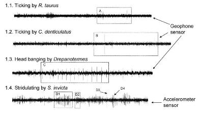 A geophone system was used to monitor activity of subterranean termites and ants in a desert environment with low vibration noise. Examples of geophone signals were recorded from a colony of Rhytidoponera taurus (Forel), a colony of Camponotus denticulatus Kirby, and a termite colony (undetermined Drepanotermes sp.) under attack by ants from a nearby C. denticulatus colony. The geophone recordings were compared with signals recorded from accelerometers in a citrus grove containing Solenopsis invicta Buren workers. Because of their small size, all of these insects produce relatively weak sounds. Several different types of insect-generated sounds were identiÞed in the geophone recordings, including high-frequency ticks produced by R. taurus and C. denticulatus, and patterned bursts of head bangs produced by Drepanotermes. The S. invicta produced bursts of ticks with three different stridulation frequencies, possibly produced by three different-sized workers. Overall, both systems performed well in enabling identiÞcation of high-frequency or patterned pulses. The geophone was more sensitive than the accelerometer to low-frequency signals, but low-frequency insect sound pulses are more difÞcult to distinguish from background noises than high-frequency pulses. The low cost of multiple-geophone systems may facilitate development of future applications for wide-area subterranean insect monitoring in quiet environments.
