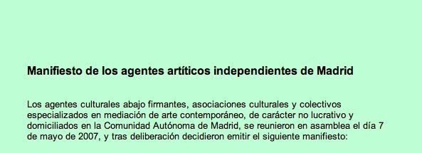 En consecuencia se promueven grandes proyectos de presupuesto millonario y carácter espectacular, como las Noches en Blanco, 1.000.000 de euros, o el Homenaje a la Movida, más de 3.000.000, e infraestructuras faraónicas, como el Matadero, 110.000.000 de euros, y otras iniciativas institucionales como la Fundación Arpegio de la CAM, que nace con 2.500.000 euros para un programa de ayudas cuyas bases tienen una clara orientación ideológica. Es un sistema donde artistas y mediadores se ven constreñidos a encajar, mientras la sociedad civil carece de algo tan elemental como un sistema de apoyo a la creación y producción artística contemporánea; sistema que ya existe, por ejemplo, para el cine y el teatro.