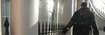 Otra de las grandes sorpresas de la exposición Global Cities de la Modern Tate londinense ha sido encontrase con el trabajo de este genial artista belga. Para esta exposición colectiva presentó un trabajo que pertenece a su proyecto Siete Caminatas -Replica 21- y que se llama Railings 2004. Consiste en un paseo sonoro por las verjas de la capital inglesa en las que va interviniendo con una baqueta, creando cadenas de sonidos con texturas y ritmos diferentes. Después presenta las películas en un montaje con tres proyectores, cada uno de ellos proyectando a un plano distinto, pero dentro de una misma sala en la que la única pared vacía es el espacio en el que se sitúa el espectador. Los sonidos de los tres vídeos se mezclan y crean un paisaje sonoro de gran riqueza e imaginación. Genial !!!