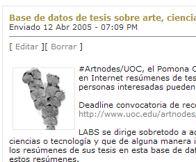 #Artnodes/UOC, el Pomona College y Leonardo/International Society of Art, Science and Technology, de MIT press, crean LABS, una base de datos que recoge en Internet resúmenes de tesis doctorales, tesinas o trabajos de final de másters que traten la intersección emergente entre arte, ciencia y tecnología. Todas las personas interesadas pueden enviar el resumen de su tesis doctoral o acceder a LABS y leer todos los resúmenes disponibles.