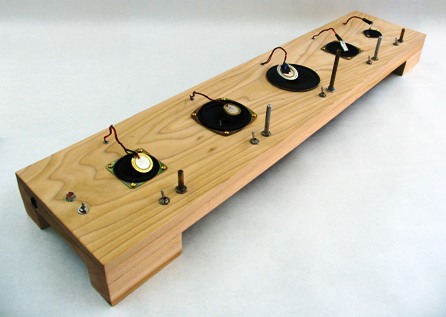 Speaker Synth is a five-speaker array with no external audio input, created by Lesley Flanigan. The only components in the system are the instrument’s speakers, piezoelectric microphones, amplifying circuits, and the hands of the performer. Speaker Synth is played by positioning individual piezo microphones with their corresponding speakers and manipulating their associated on/off and volume controls to induce a variation of feedback effects. During the performance, samples from both Speaker Synth and a vocalist are captured and sequenced to build a dense sonic pallet of rhythms and melodies. The performance explores music making through structuring noise, highlighting relationships between analog and digital sound synthesis and between human voice and the voice of an instrument.