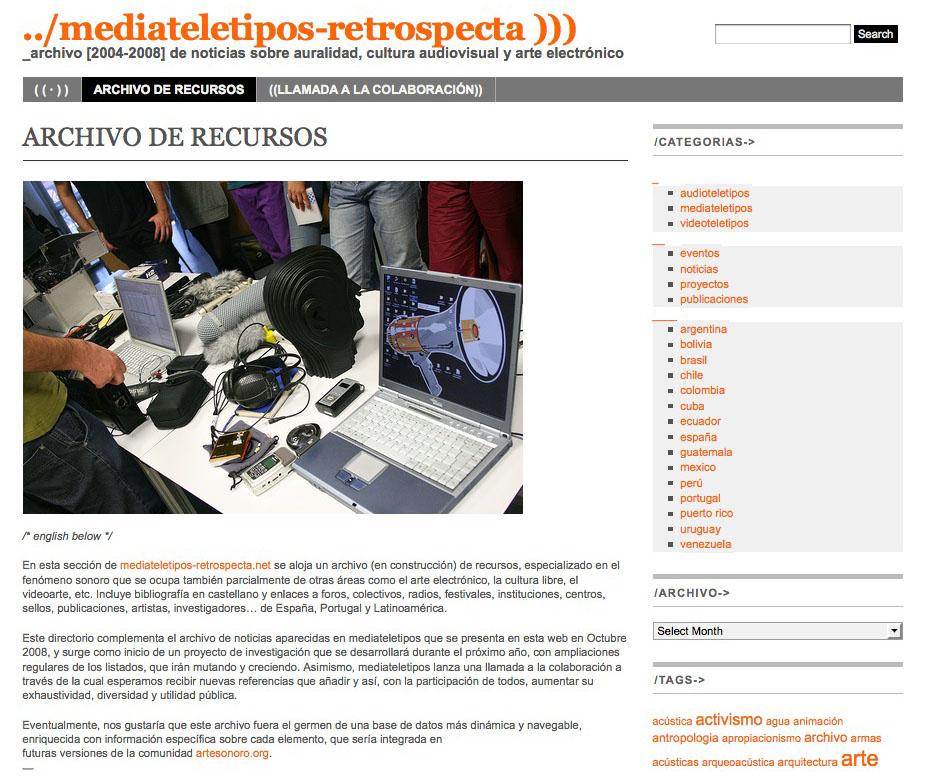 Following the invitation to participate, we decided to create an archive with all the news related to the Spanish, Portuguese and Latin American scenes published on mediateletipos. Therefore, it has been launched a new web containing all those posts (about two thousand, approximately half of the published total until now). This material has been reviewed and classified into several categories, with the addition of many descriptive tags that simplify and enhance its navigation.
