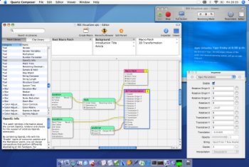 Quartz Composer is an application that makes use of the advanced graphics capabilities of CoreImage to create dynamic and interactive motion graphics. It includes support for MIDI, QuickTime playback through Core Video, real-time Core Image filters, audio & video capture, external data sources like RSS feeds or Spotlight, simple JavaScripts and much more… the result of which can be integrated into an application, saved as a standalone viewer, or exported as a Mac OS X screen saver module. All of this functionality is accessible through an simple graphical interface and without writing a single line of code.